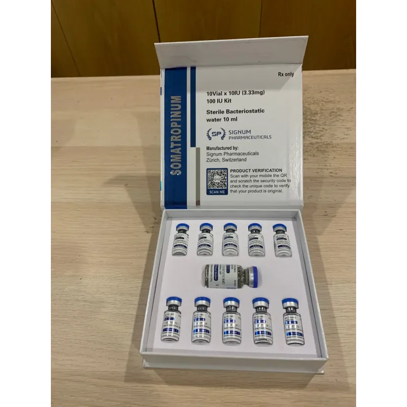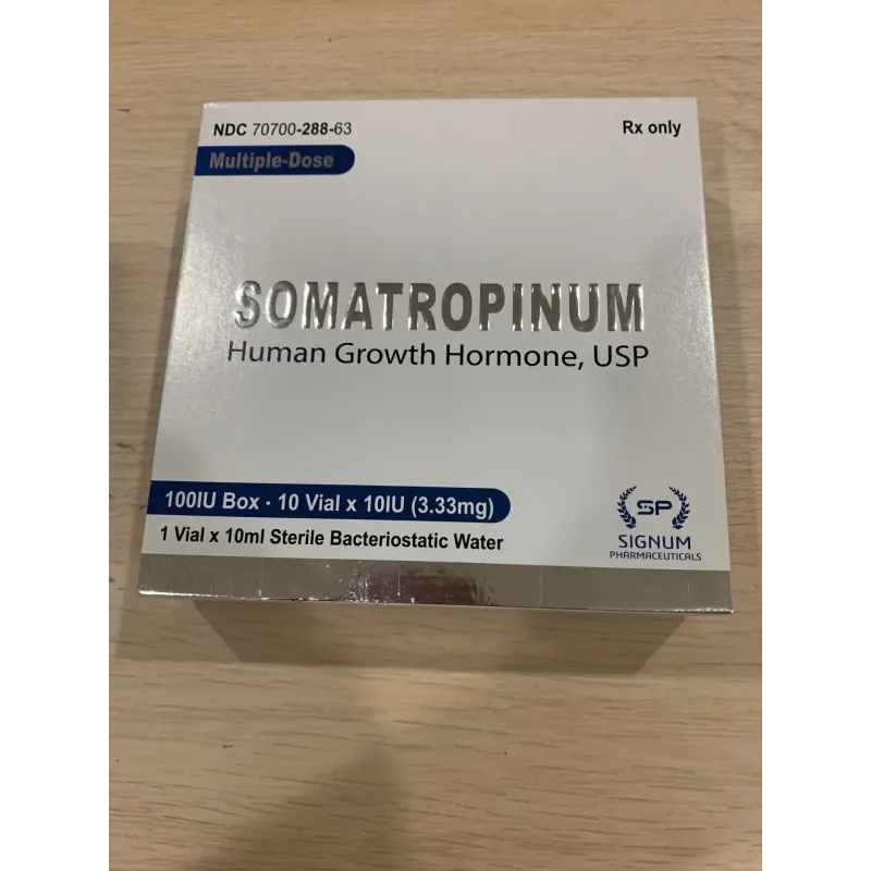 Somatropina 100 UI Signum. Hormona de crescimento recombinante para crescimento anabólico. A somatropina é uma forma de hormona de crescimento humano. A hormona de crescimento humano é importante no corpo para o crescimento ósseo e muscular.